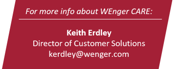 WEnger CARE is not about pushing parts and new equipment you may not need. Wenger service teams always have your best interest in mind when recommending potential solutions, which can often be more about process adjustments and proper maintenance. If replacement parts are needed, Wenger will help you make intelligent choices based on your equipment and budget.